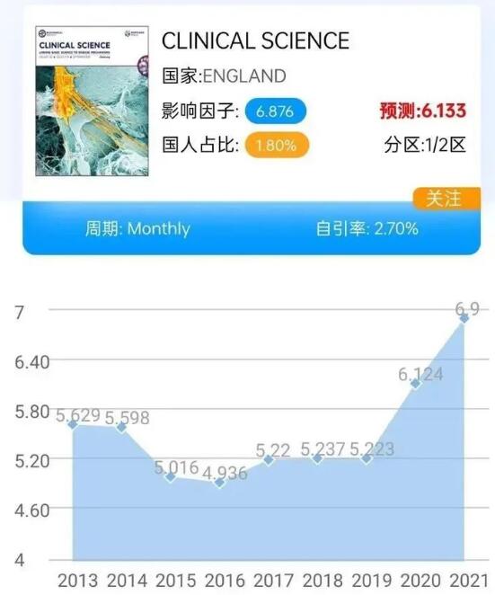 它的中文名字大家可能更熟悉,叫做《臨床醫(yī)學(xué)雜志》。這本期刊最近的影響因子很不錯,達(dá)到了4.964,而且自引率只有4.90%。它的主要研究方向是醫(yī)學(xué),更具體一點,是內(nèi)科相關(guān)的醫(yī)學(xué)研究。