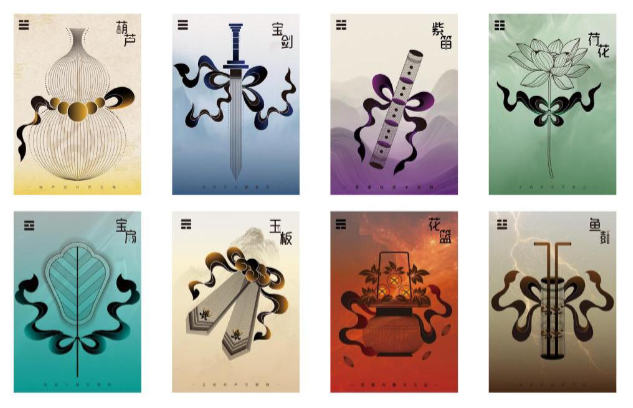 八仙分別對應八卦,代表 “男女老少,富貴貧賤”,其法器作為獨特視覺元素,具備再設計基礎,深入研究可豐富傳統元素成果,運用設計思維再設計可讓傳統元素煥發新活力,傳承和傳播八仙文化。